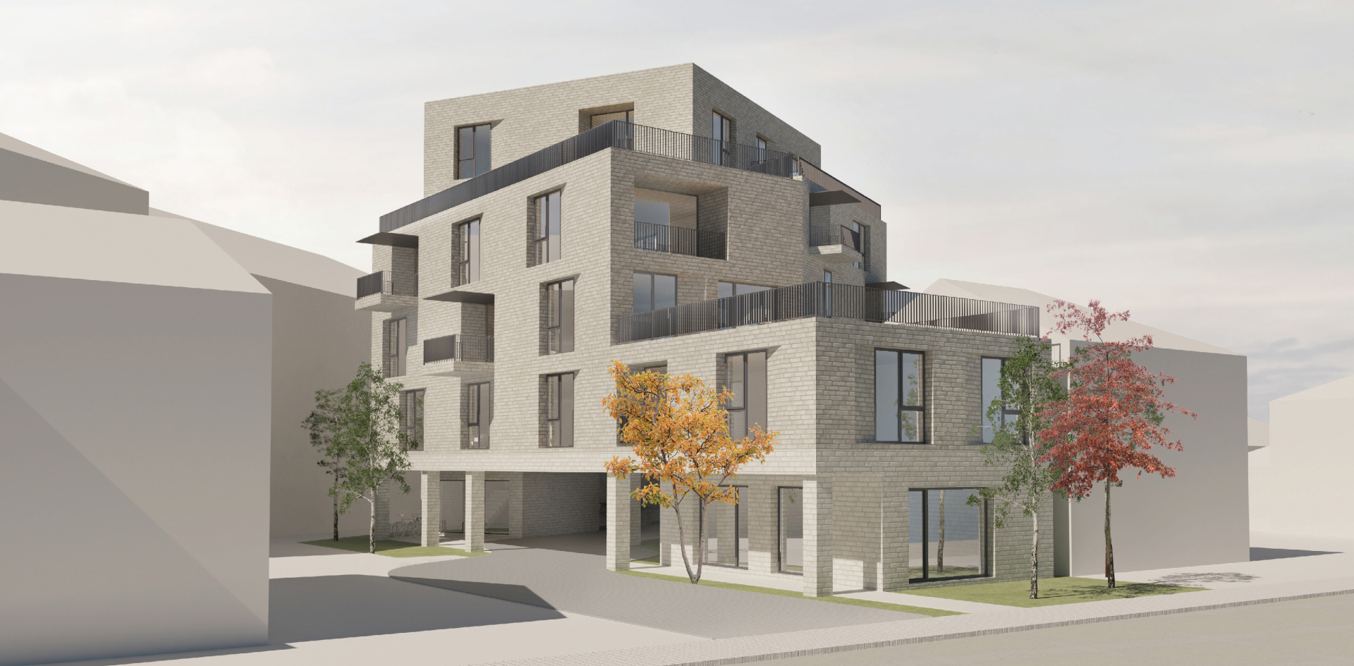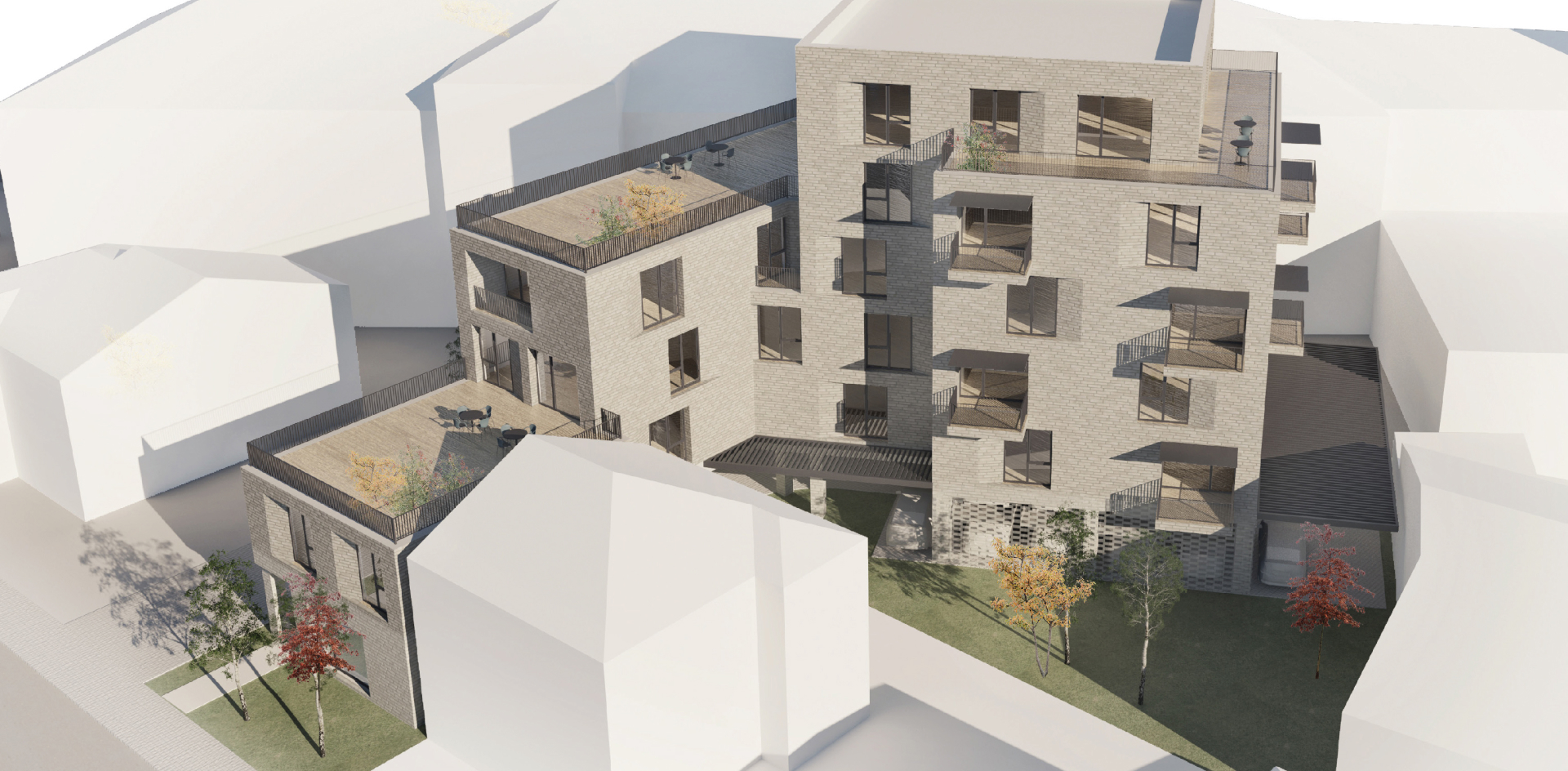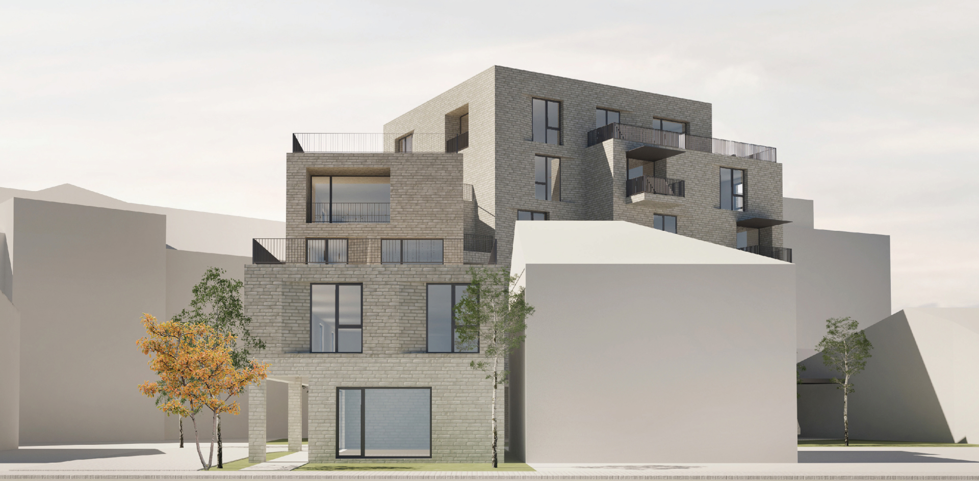 Considering the unique shape of the site and having to position the building ‘deep’ into the urban fabric, the volume is carefully sculpted in order to minimize the shadow casted on the neighbours as much as possible. The building gradually steps up from 2 levels towards the street to 6 levels at its maximum.