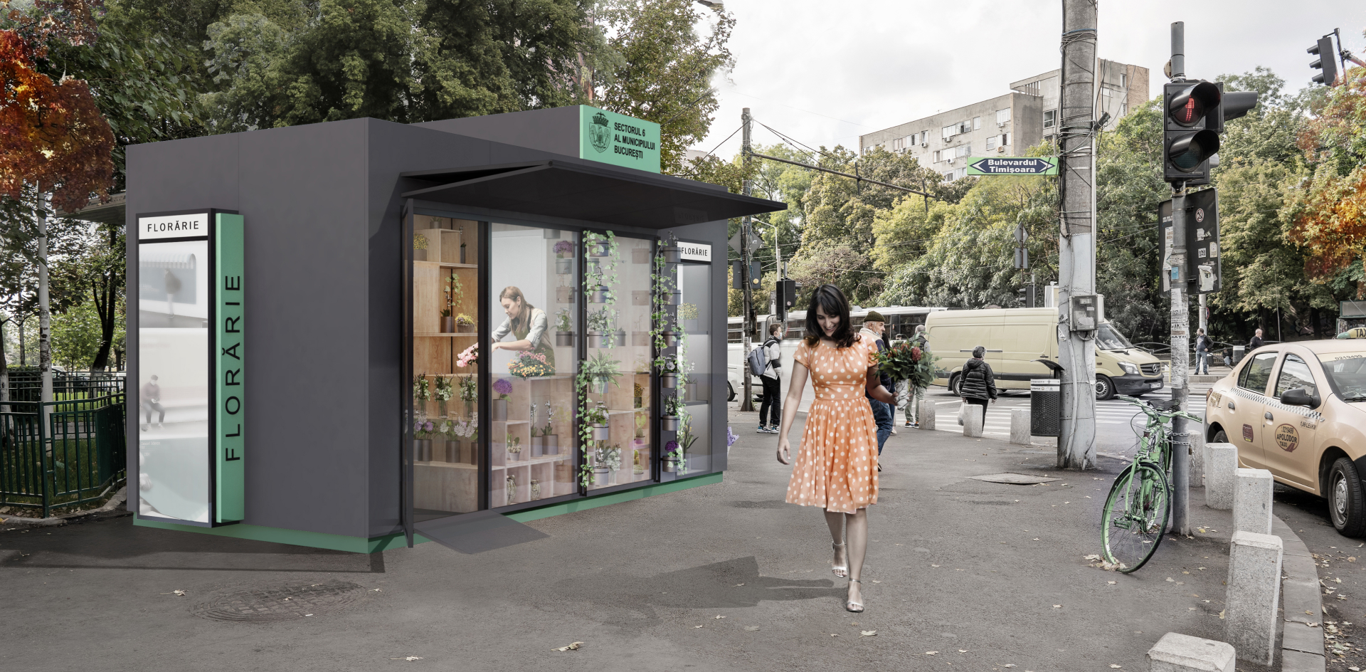 The kiosk has a shape that discreetly integrates into the context. The vertical accent, on which the logo of District 6 is marked, is a landmark, a visible signal both during day and night. The two types of kiosks have a unitary language, the differentiation being made at the level of detail. The assignment of colors – green for the flower shop and orange for the news stand, makes their destination visible both from a distance and at night. Another element visible at night is the bright display case where products specific to each kiosk can be displayed.
