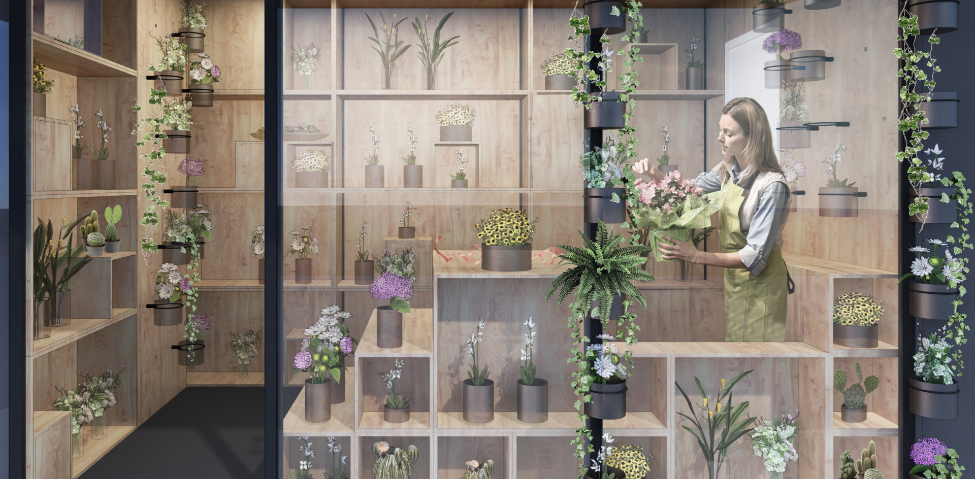 The furniture has been carefully designed to maximize the display and storage space and to adapt over time according to needs. With minimal modifications, the change of destination from a newsstand to a flower kiosk and vice versa can be easily made.