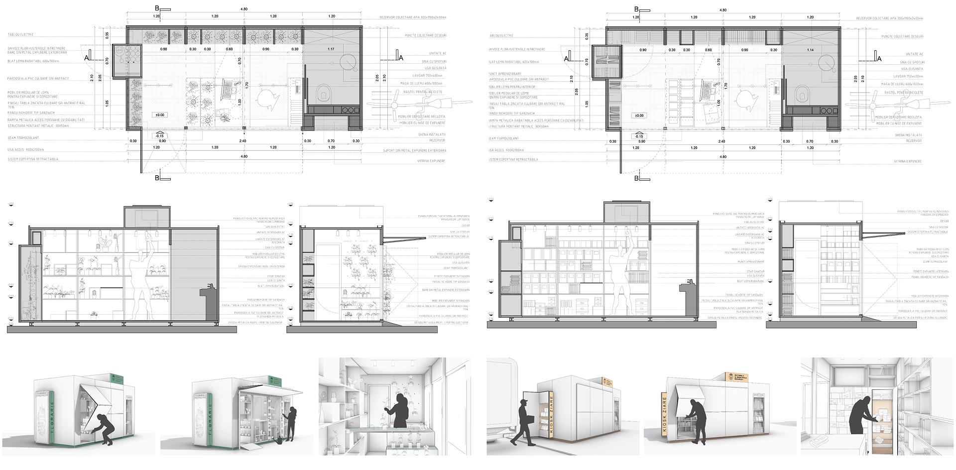 The project is based on a 2.10×1.20 structural module which, depending on the approached furniture, is divided into 4 types. By combining these types, kiosks of various sizes can be obtained, easily adapting to any location. To make the process more efficient, both the newsstand and the flower kiosk are composed of the same modules.