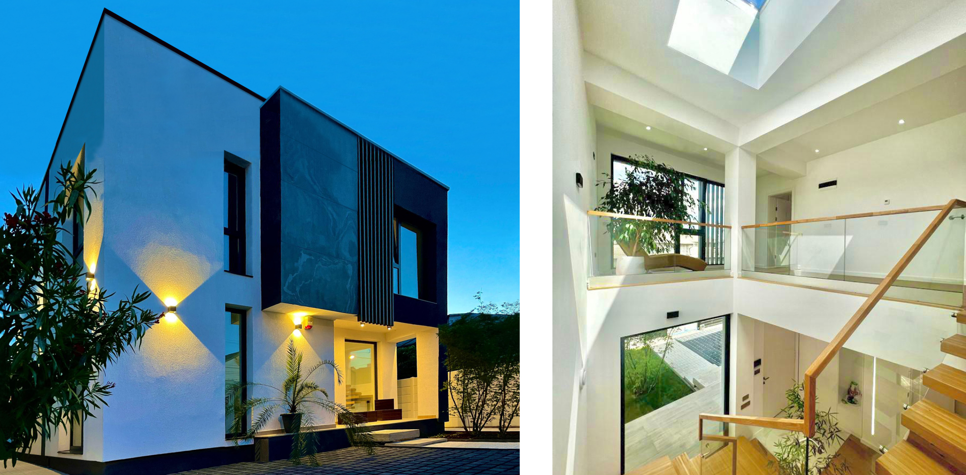 The interplay of dark and white surfaces on the facade gives the house a clear identity — bold yet understated. Inside, natural wood, glass railings, and lush greenery soften the architectural lines and reinforce the sense of openness and balance.
