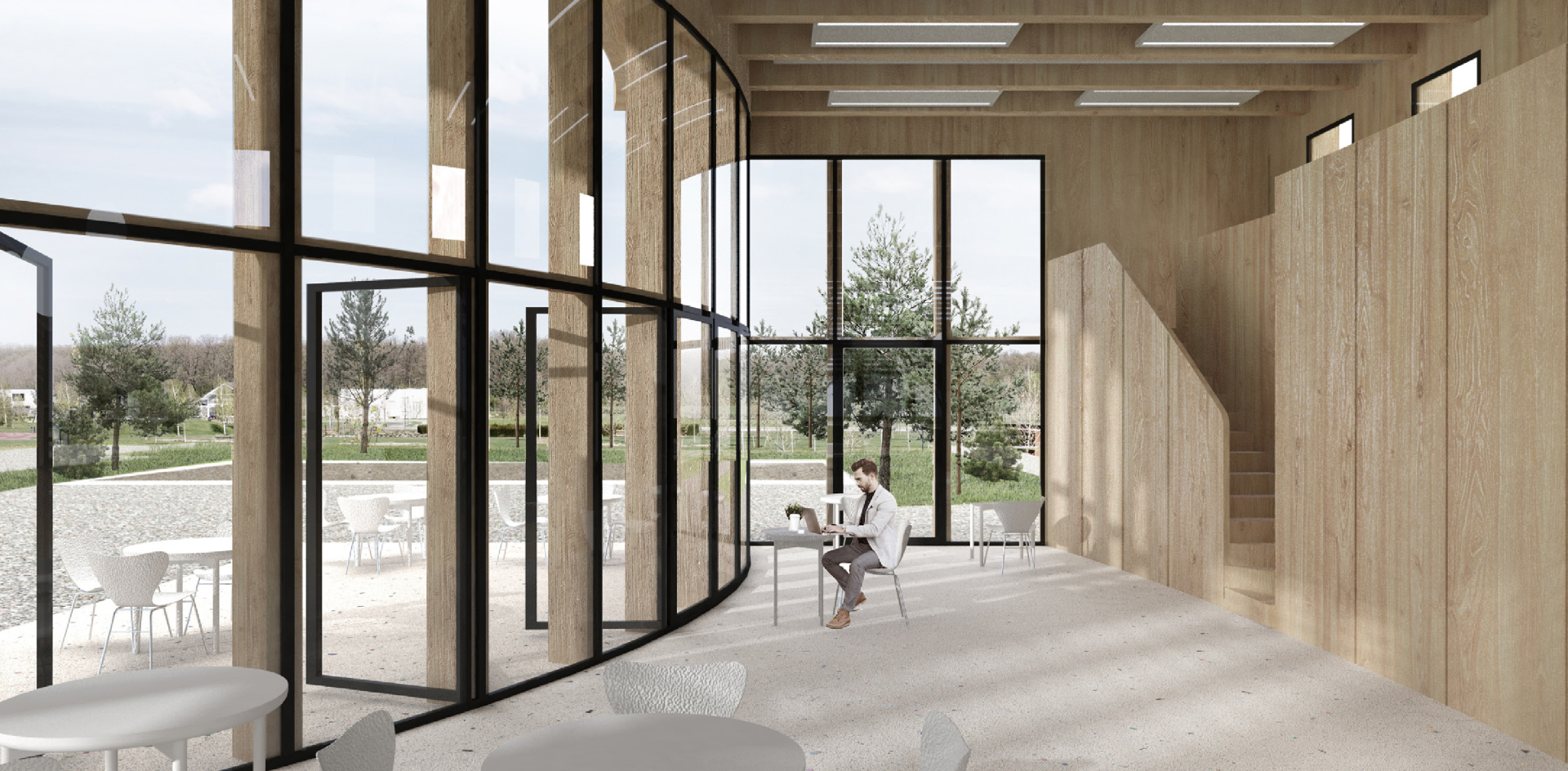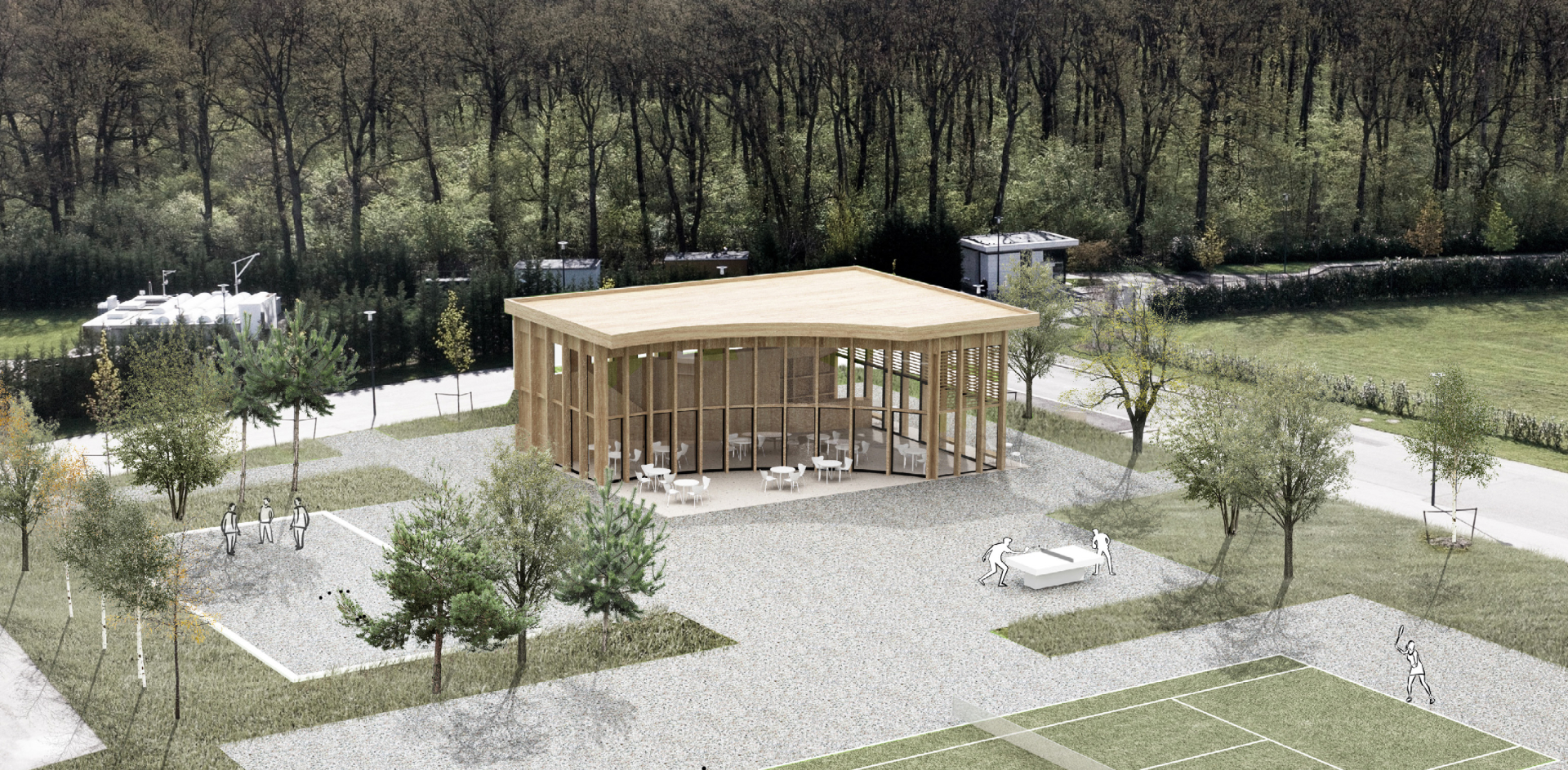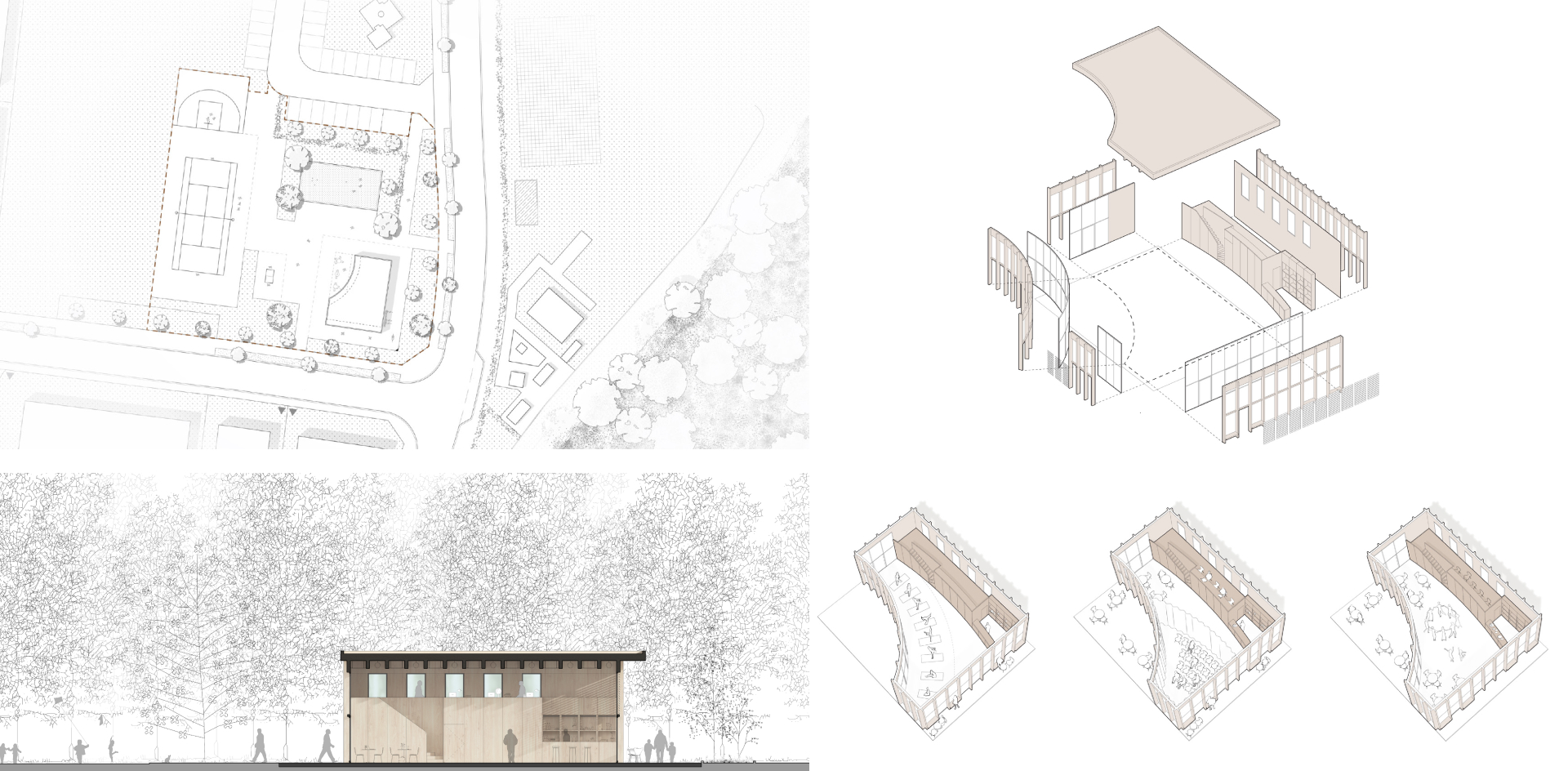 Built from sustainable CLT and open to seasonal use, the structure hosts a variety of informal activities – from café moments and workshops to neighborhood events – all gently held within a soft, adaptable form.