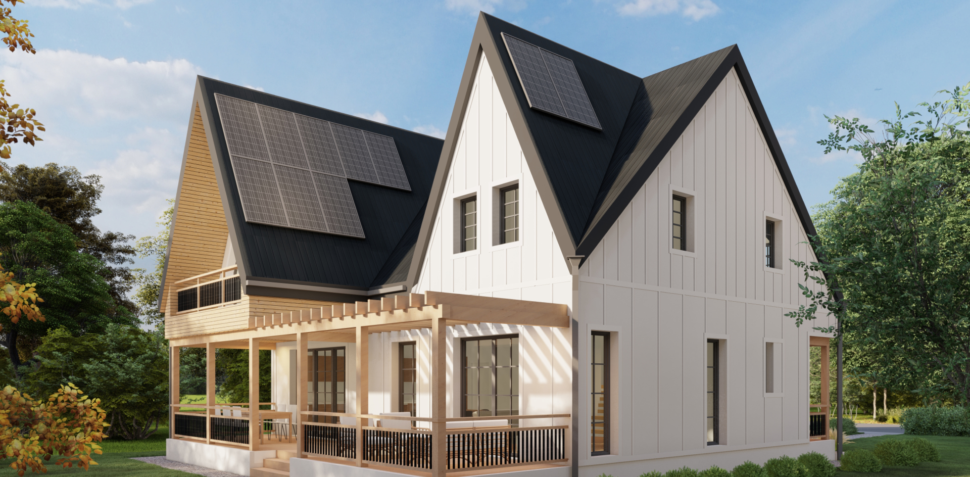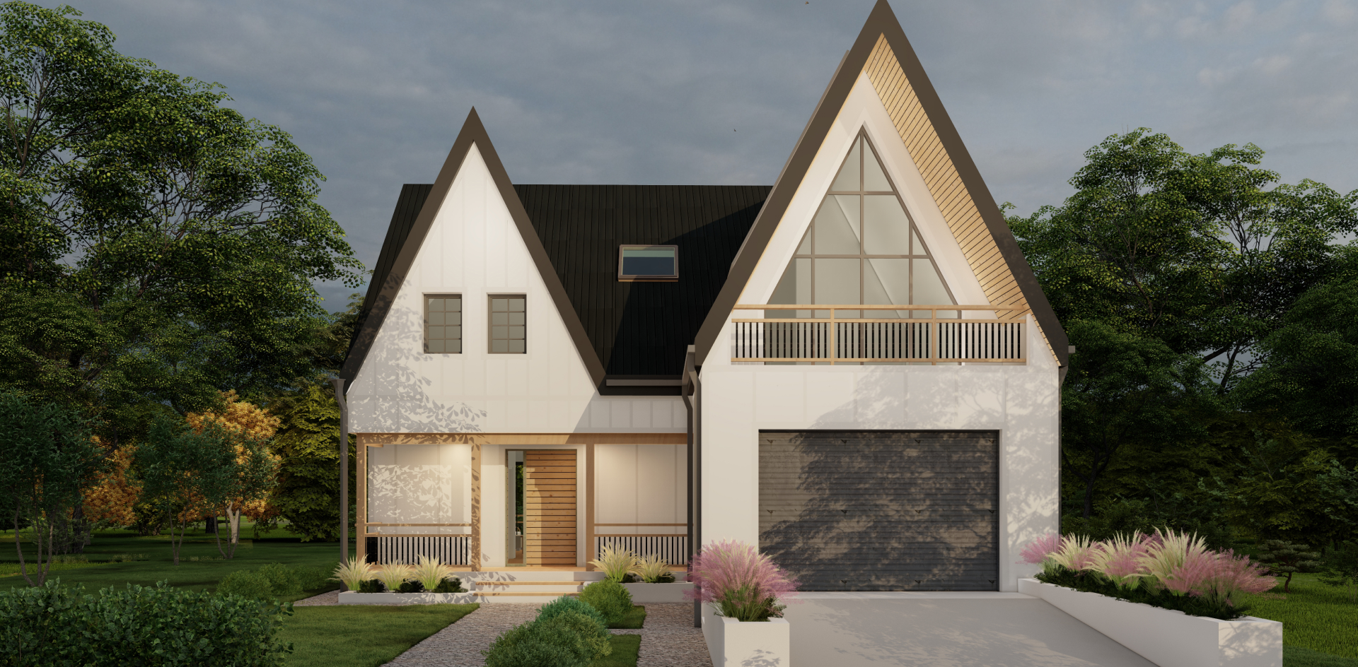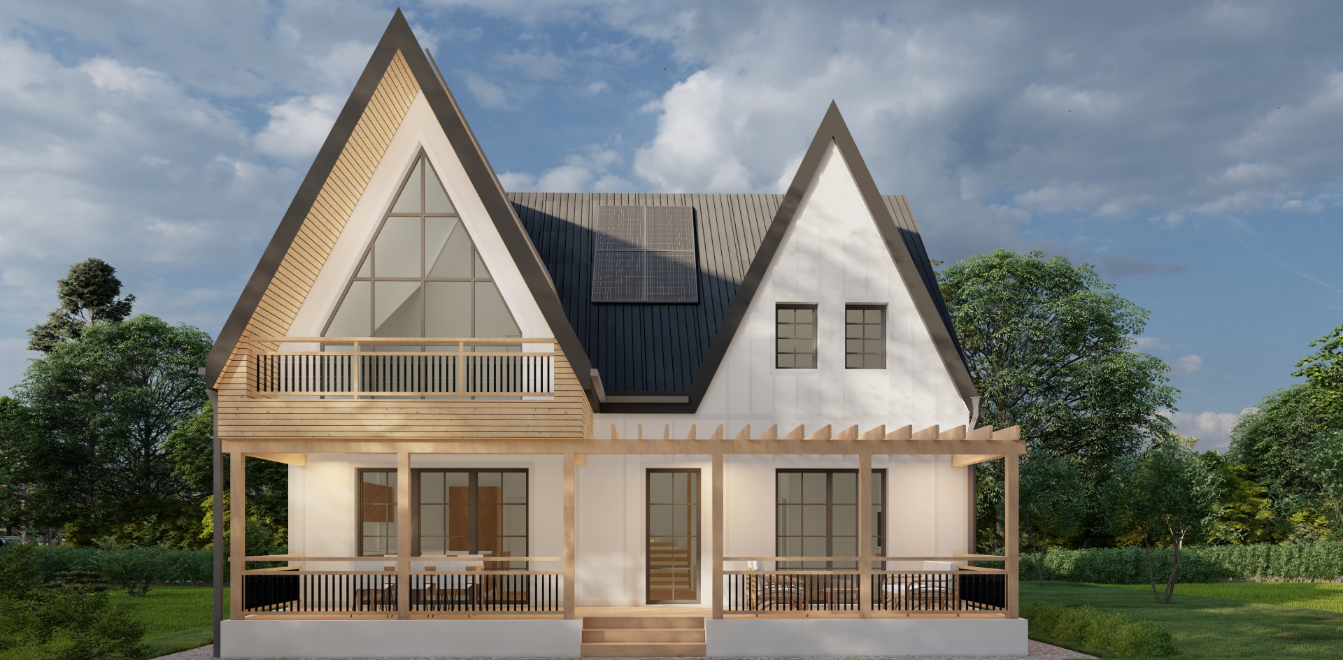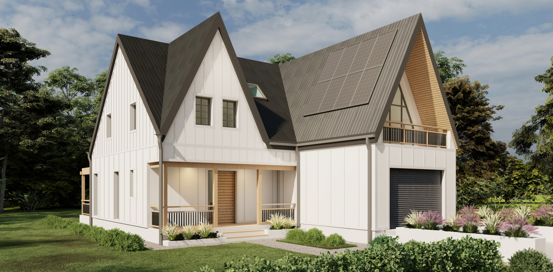 A contemporary take on the American farmhouse style, Pine Gables is a single-family home that blends traditional shapes with modern, sustainable solutions. The clean volumes, steep gable roofs, and vertical white siding create a striking yet warm architectural presence, while natural wood accents add texture and softness.