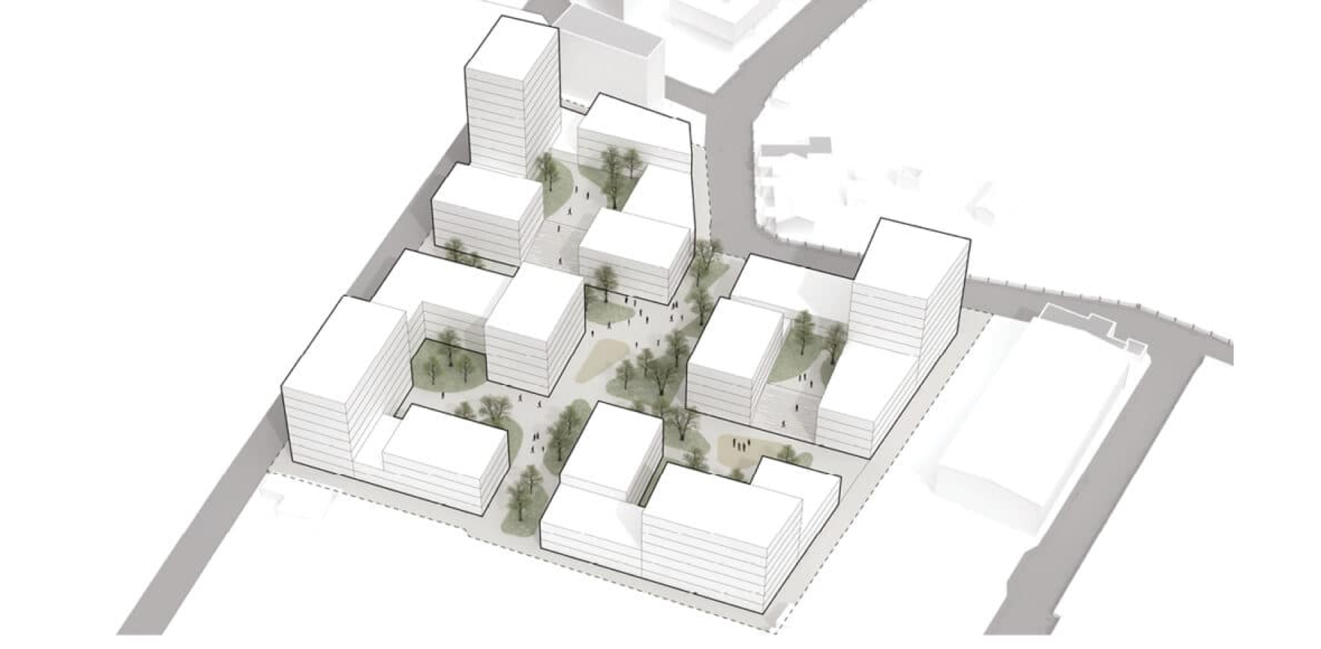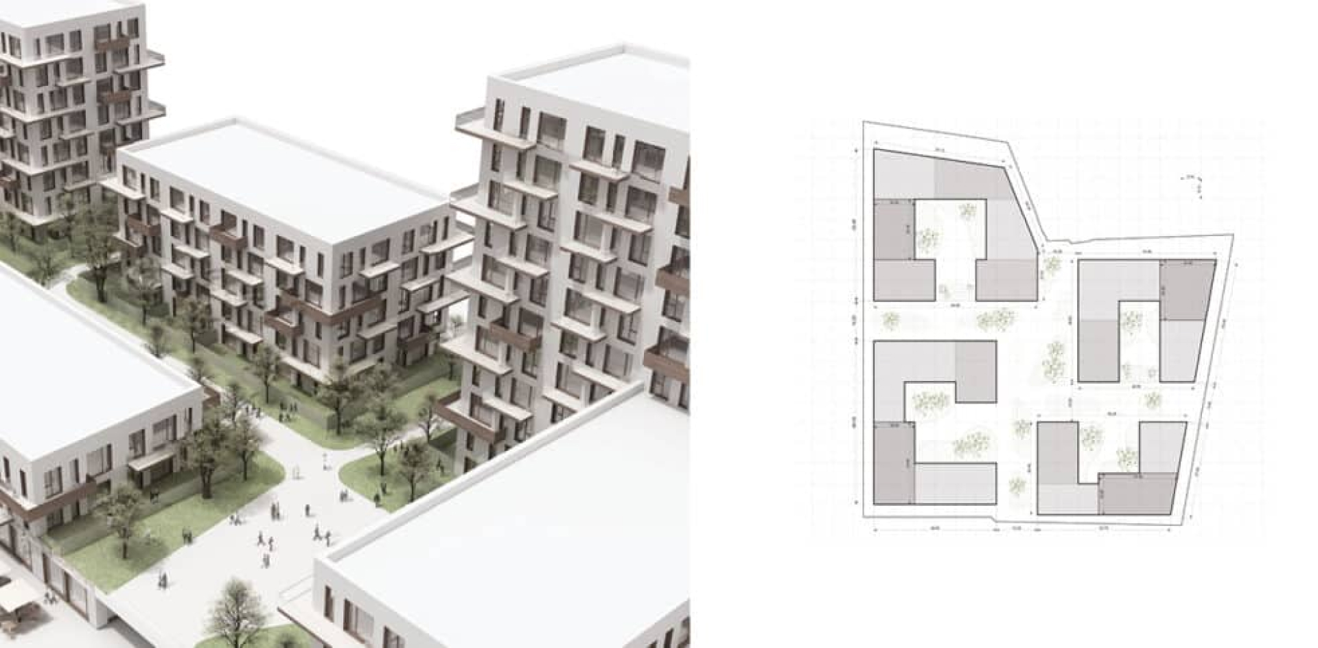 The project displays a hierarchy of interconnected spaces: from the main public plaza, situated at the intersection of the two main paths, to the shared courtyards that each building block has, to the private terraces and balconies. Thinking about the light/shadow dynamic, the tall towers are placed on the edge of the ensamble.