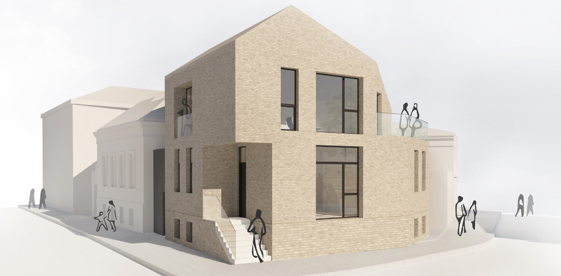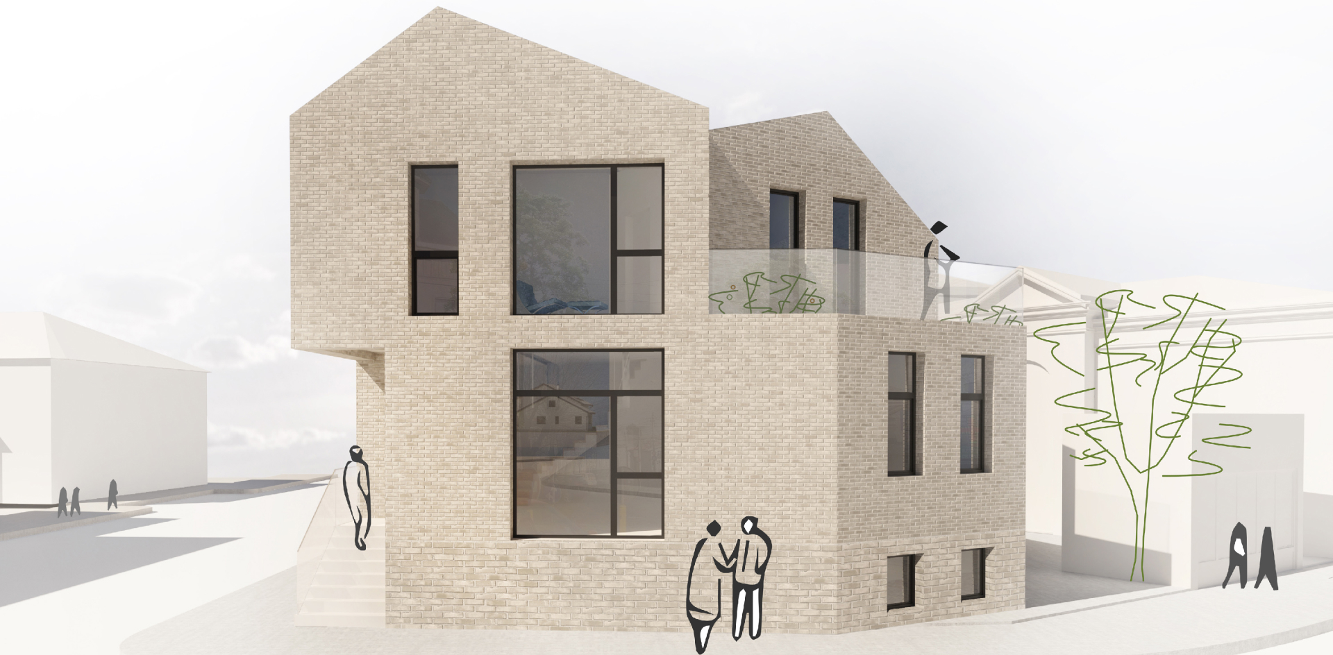 The dynamic volume closes the site’s perimeter and vertically marks the intersection. The corner entrance is easily visible from the main street. While the asymmetric roof was designed as a reinterpretation of the traditional shape, the warm colour of the beige brick facade bears resemblance to the neighbouring old buildings.
