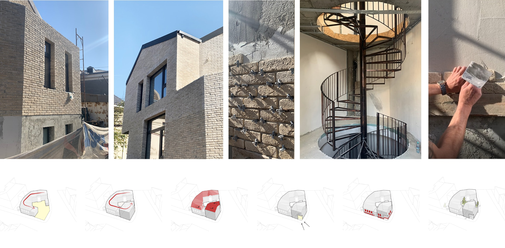 Furthermore, the slight change in the brick pattern relates to the height register of the surrounding buildings: the bricks are laid vertically for the base/plinth and above the windows. The bright interior accommodates office spaces with a kitchenette area and a terrace, waiting areas and plenty of storage and archive rooms, suited for a notary’s office.