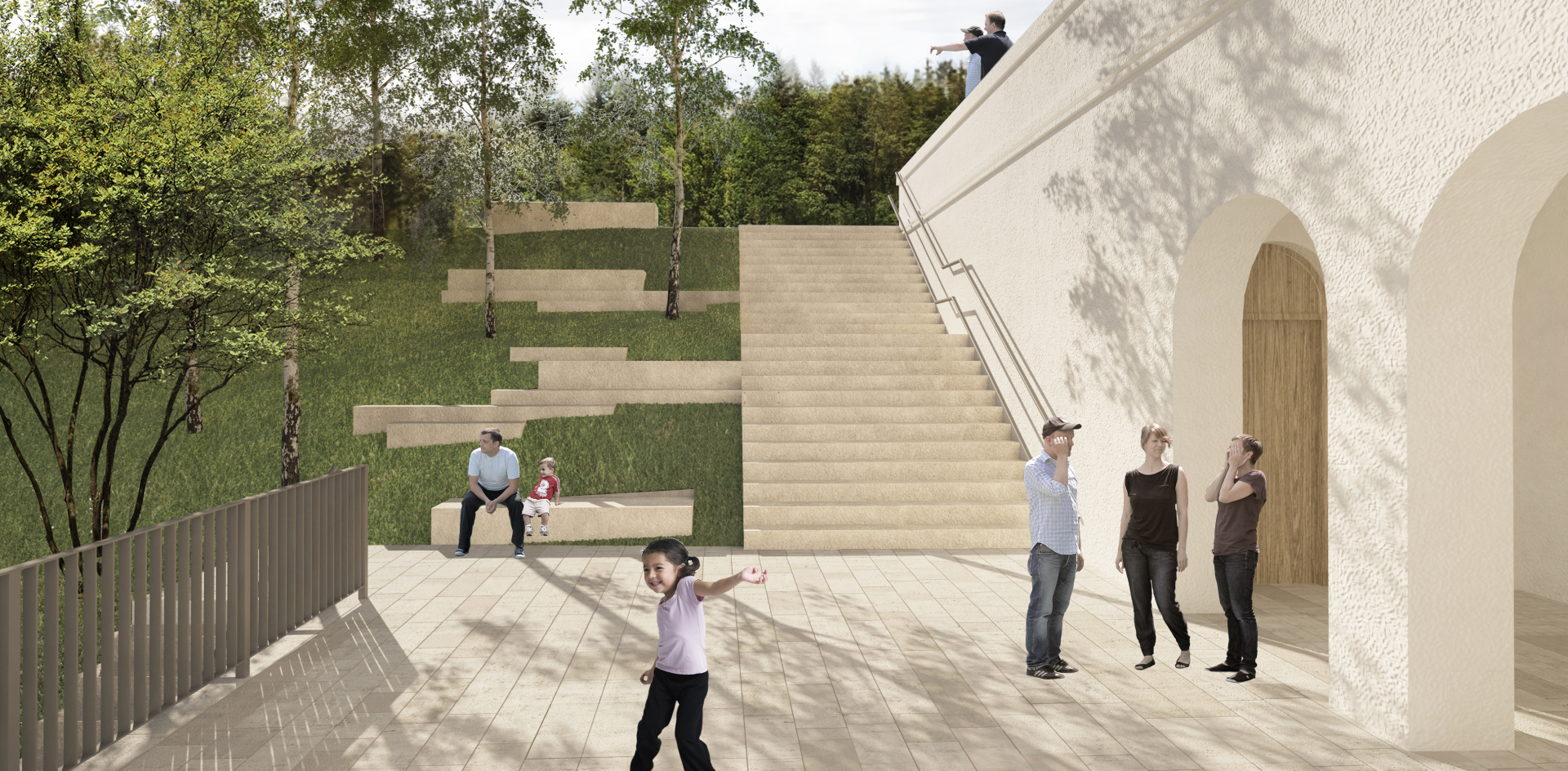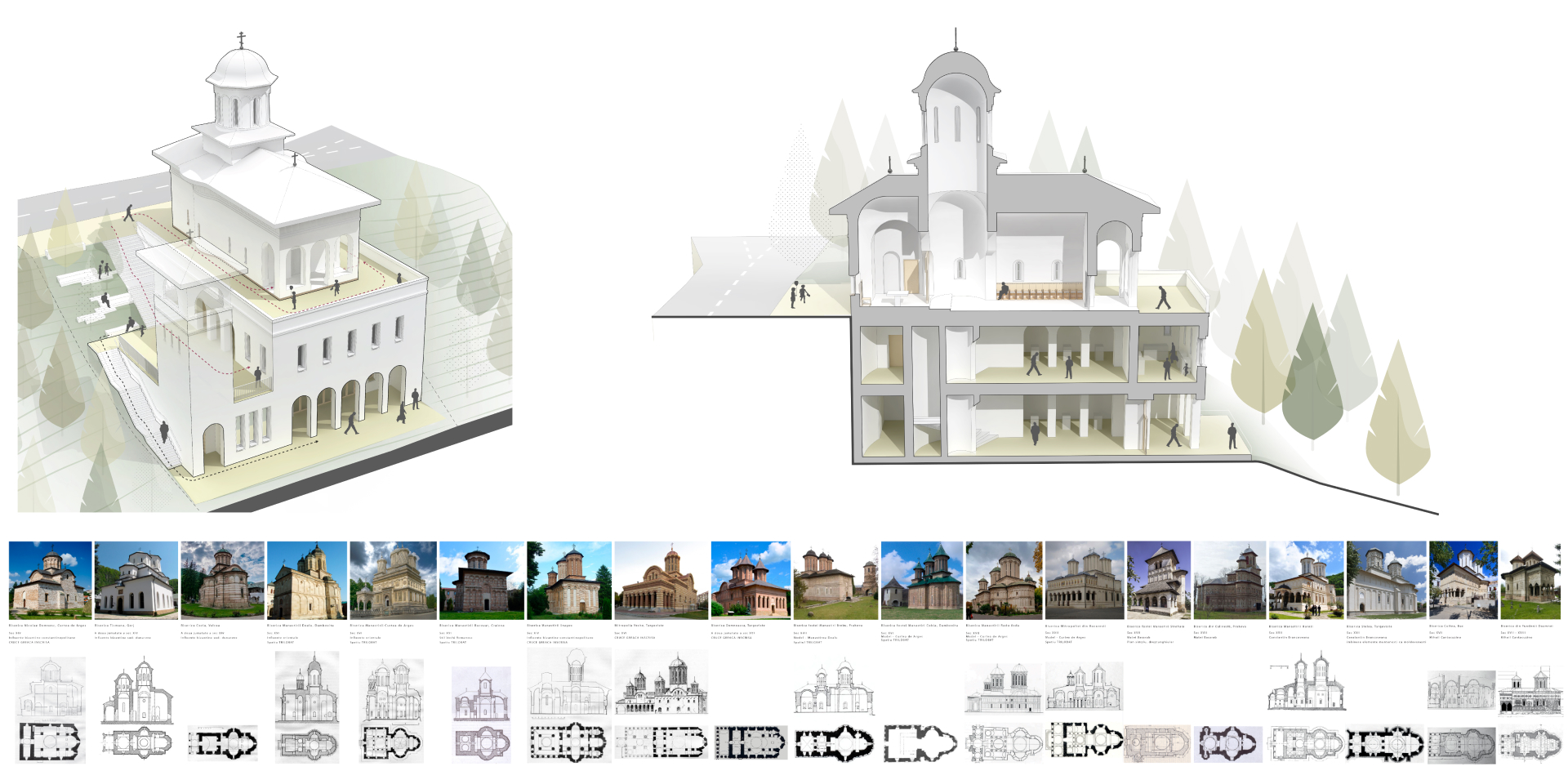 The project enhances the community aspect of a church through dedicated spaces: the library, exhibition spaces, workshops. The natural relief plays an important role as well – the project is taking advantage of the mountain slope that is sitting on, creating sitting places, promenades, view spots etc.